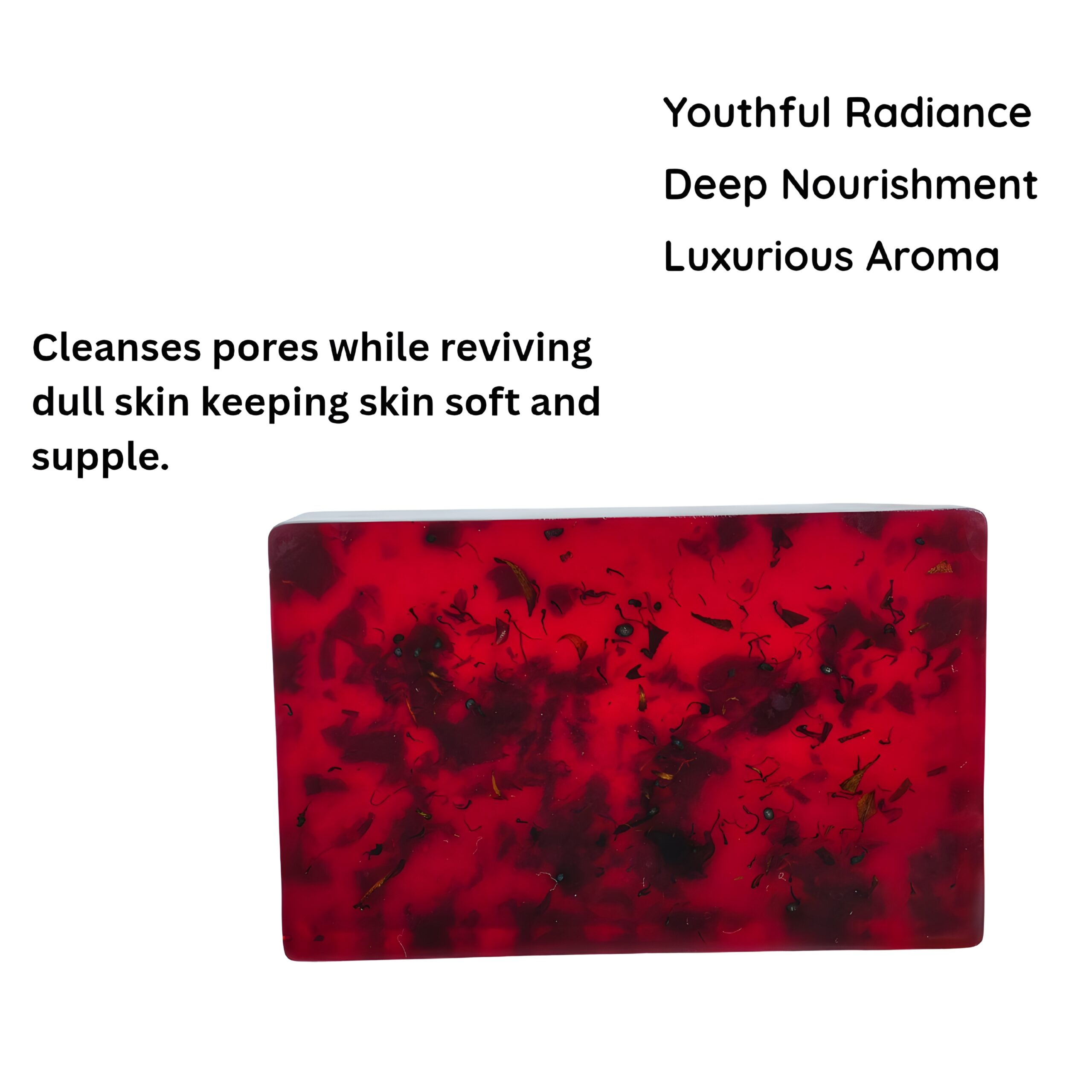 This handcrafted soap blends Red Wine, Pomegranate, and Rose for a gentle cleanse suitable for all skin types. Enriched with Coconut Oil, it removes impurities without drying the skin.
