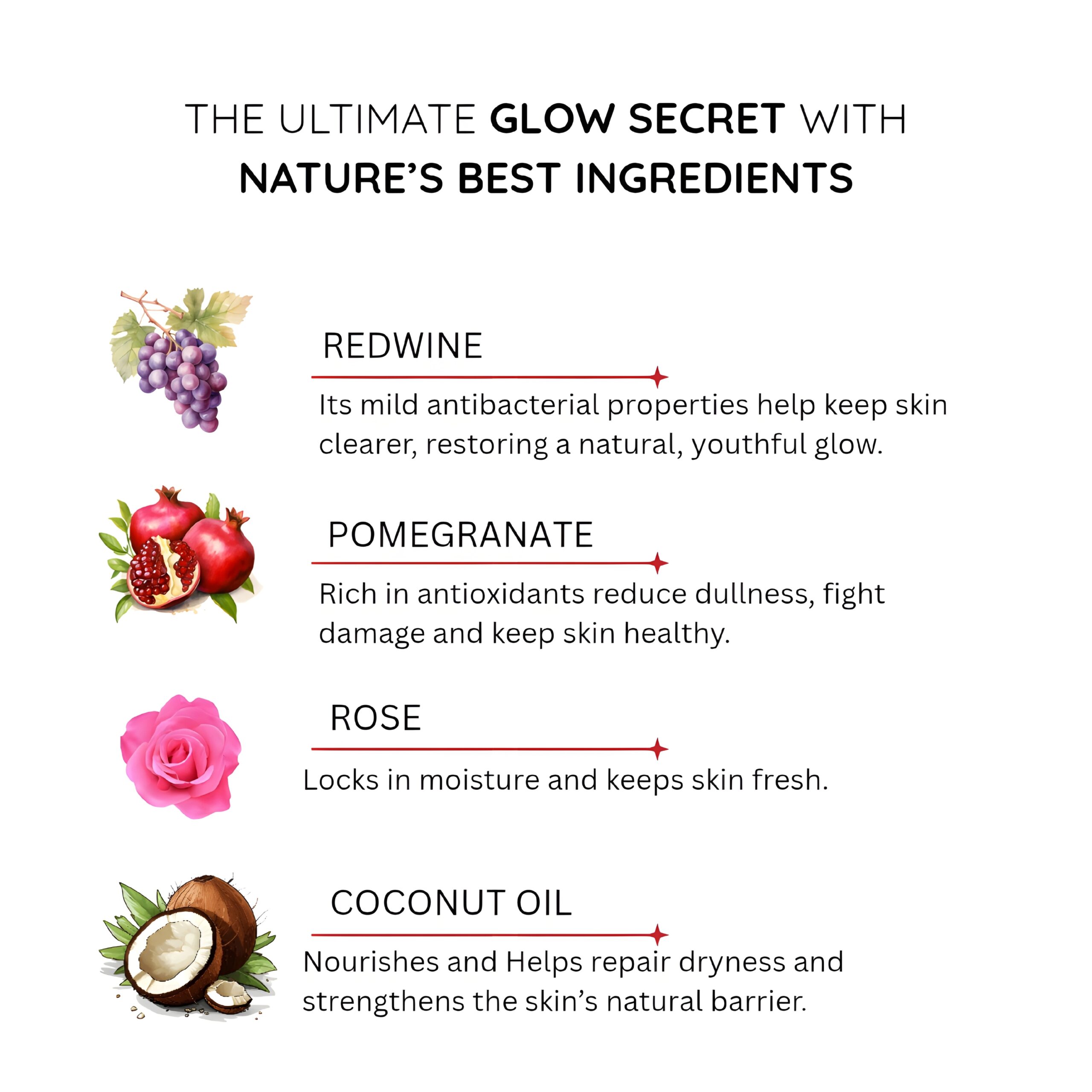 Coconut Oil, Palm Oil, Propylene Glycol, Sorbitol, Glycerin, Lauryl Glucoside, Myristic Acid(Coco Derived), Aqua, Cocamidopropyl Betaine, Castor Oil, Red Wine Extract, Pomegranate Extract, Rose Flower Extract, Rose Petals, Disodium EDTA, Sodium Hydroxide, Disodium EDTA, Fragrance oil.